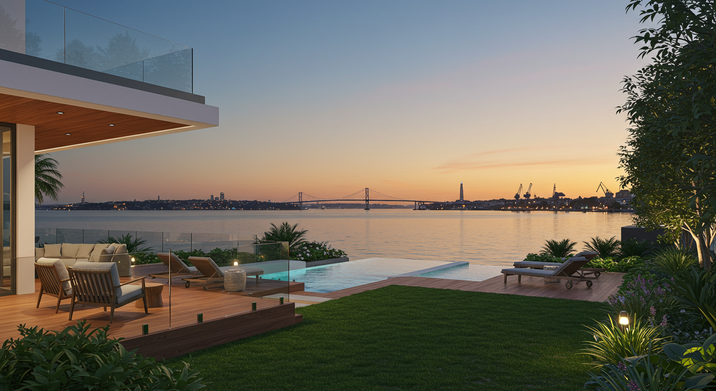 - Level harbor front garden with lush lawn, sun deck, infinity-edge swimming pool and cabana plus two rooftop garden areas