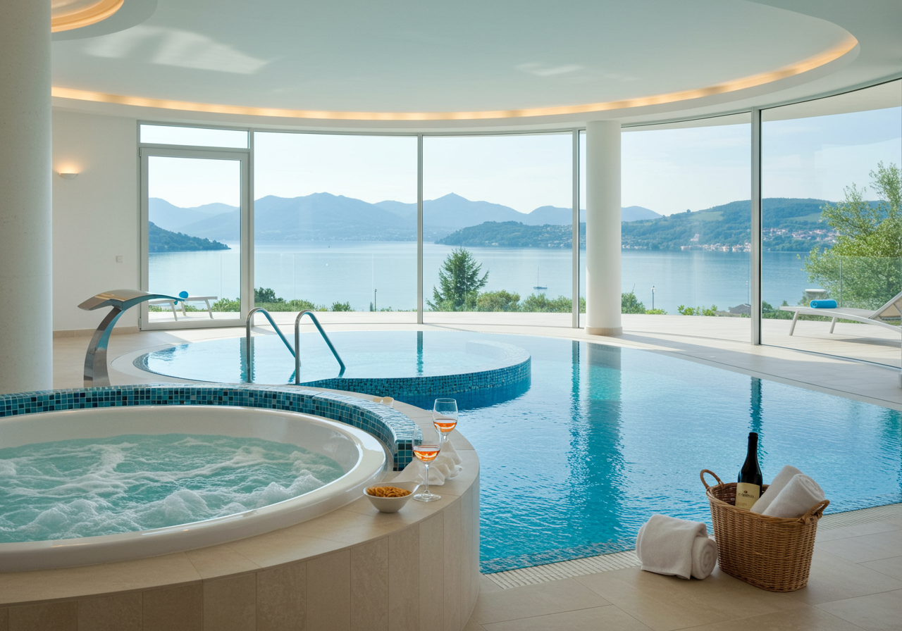 The ground floor consists of a fully fitted kitchen, dining room, living room with fireplace, laundry room, and toilet. The villa’s highlight is a spacious wellness area with fitness, an indoor pool, a whirlpool tub, a sauna, a massage room, and a shower on the ground floor.